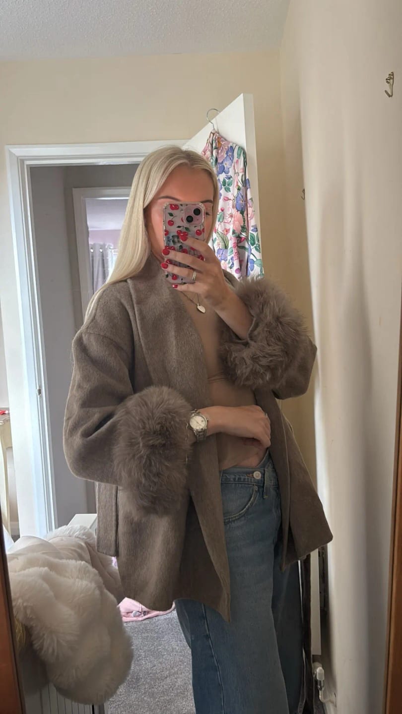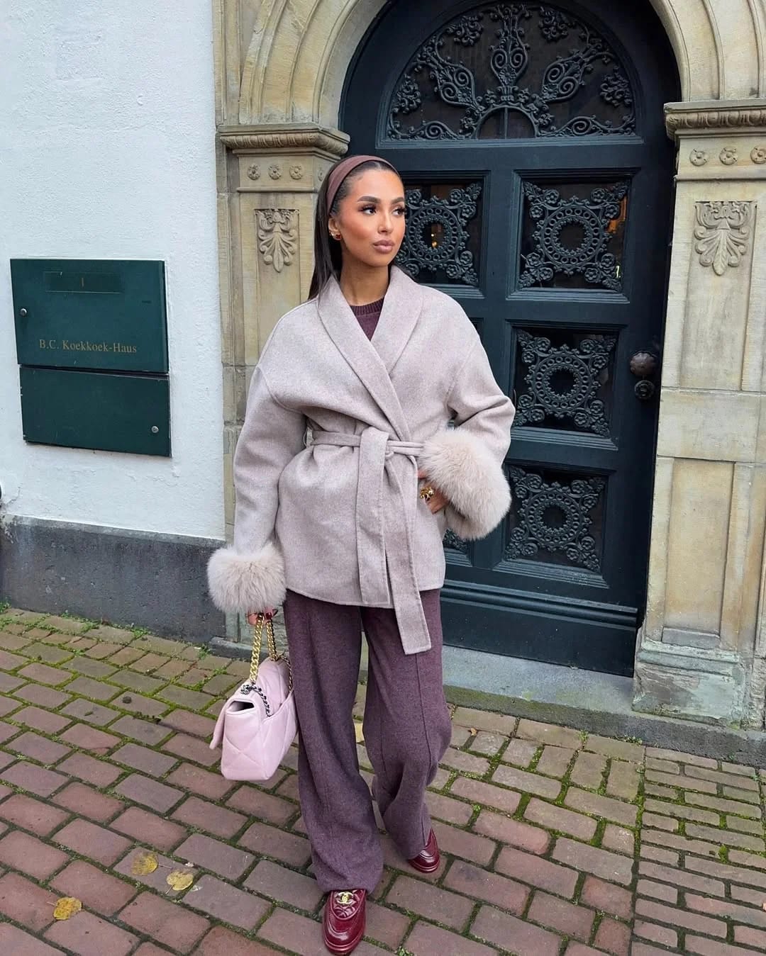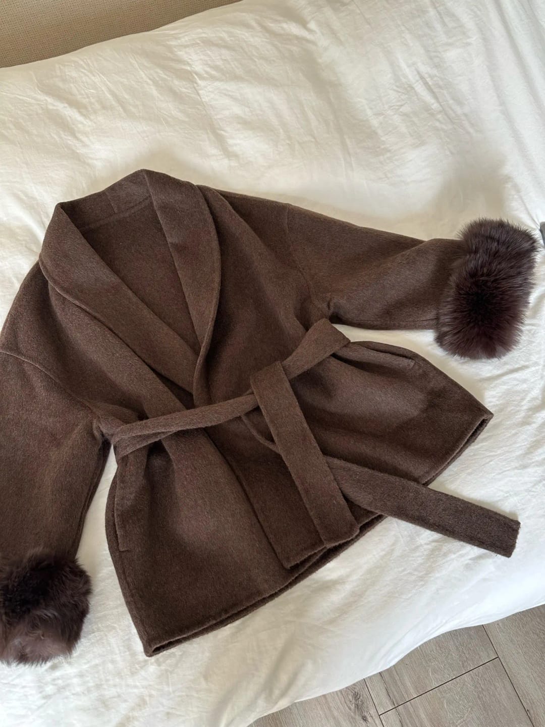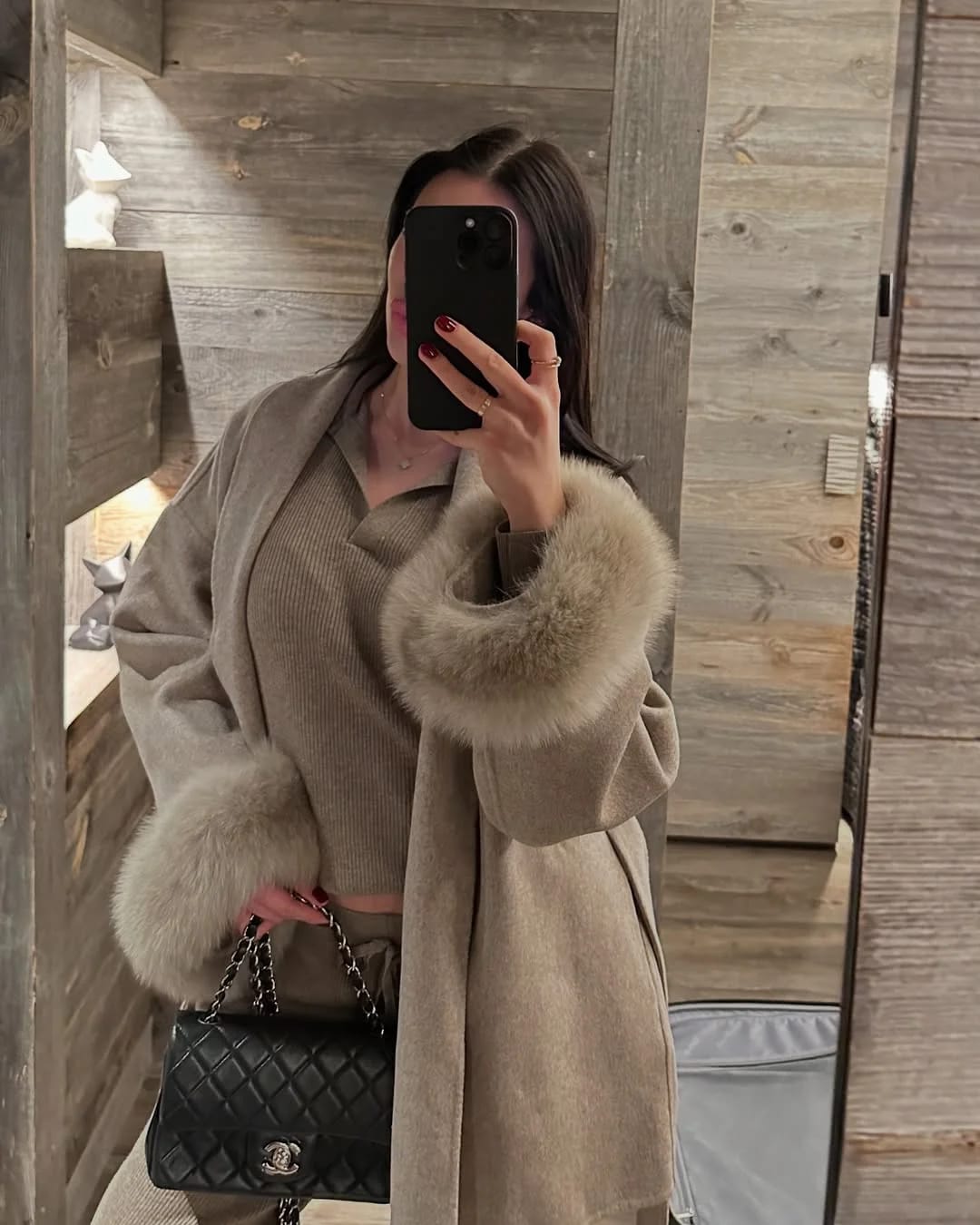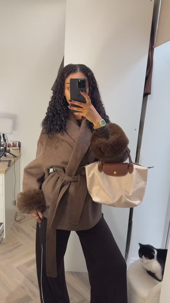 Ses manches ornées de délicates finitions en fourrure ajoutent une touche de caractère et de luxe discret. La texture riche de son tissu et la profondeur de son brun chocolat font de Nala une pièce élégante, à la fois moderne et indémodable.